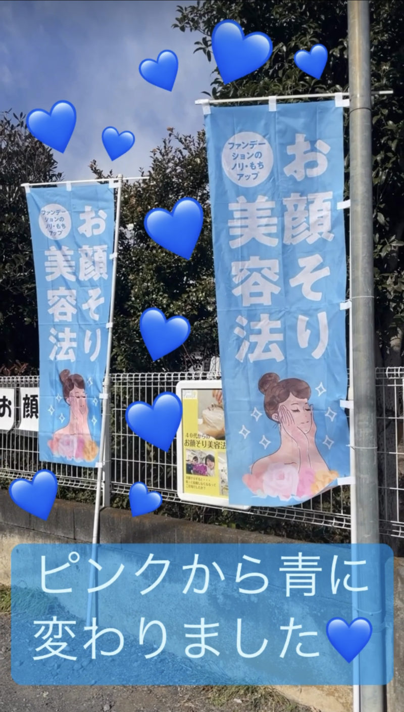 今までの集客方法を振り返るとチラシ新聞、折り込み、ポスティング地域の広報誌、Googleインスタそしてのぼり旗があります。今回は久々にのぼり旗を変えてみました。ネットで調べるとお顔そりのサロンが増えてるんだなぁっていうの感じられました。そしてお顔そり美容法の旗も販売してましたので、今まではピンク色でしたが、ブルーにしてみました。
