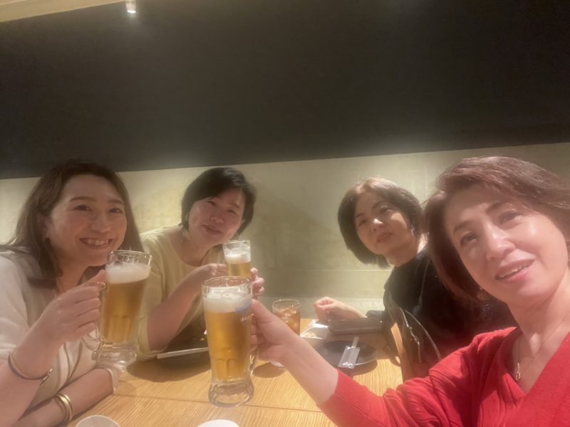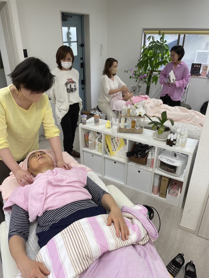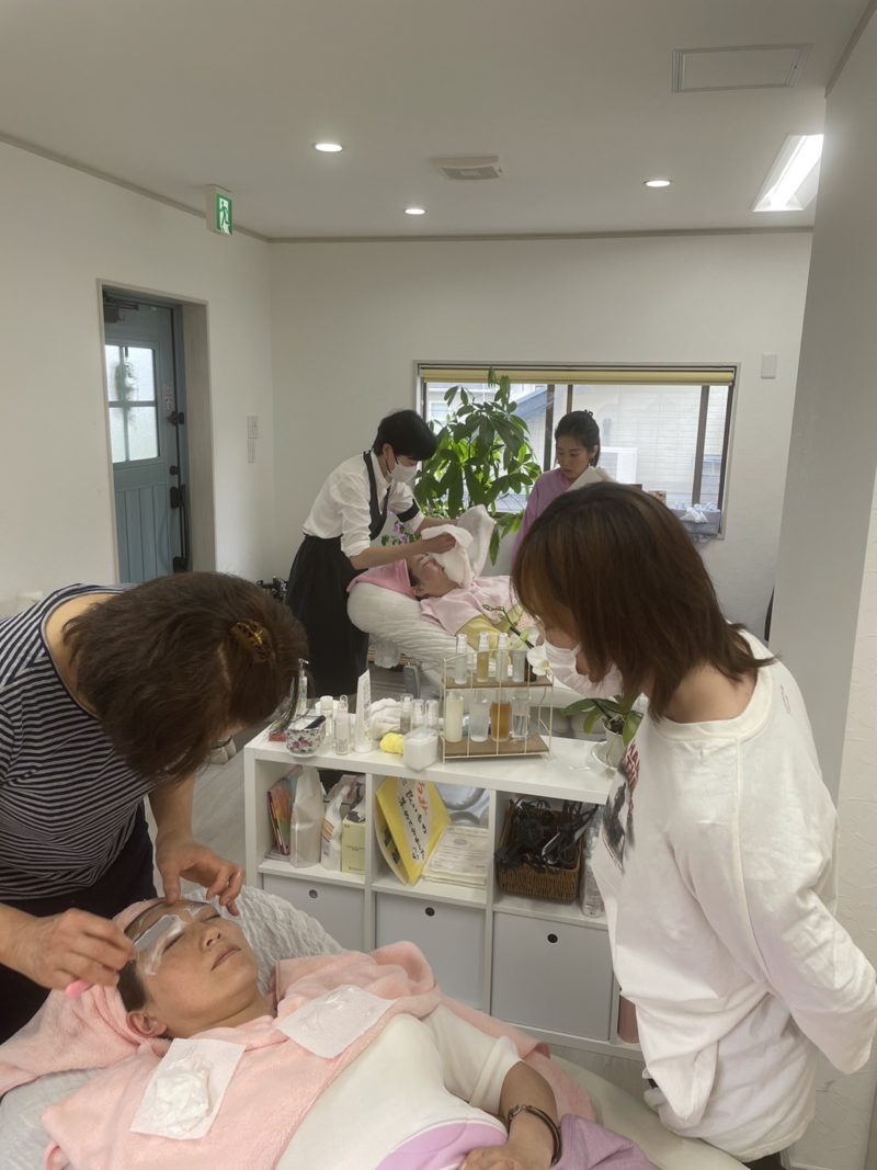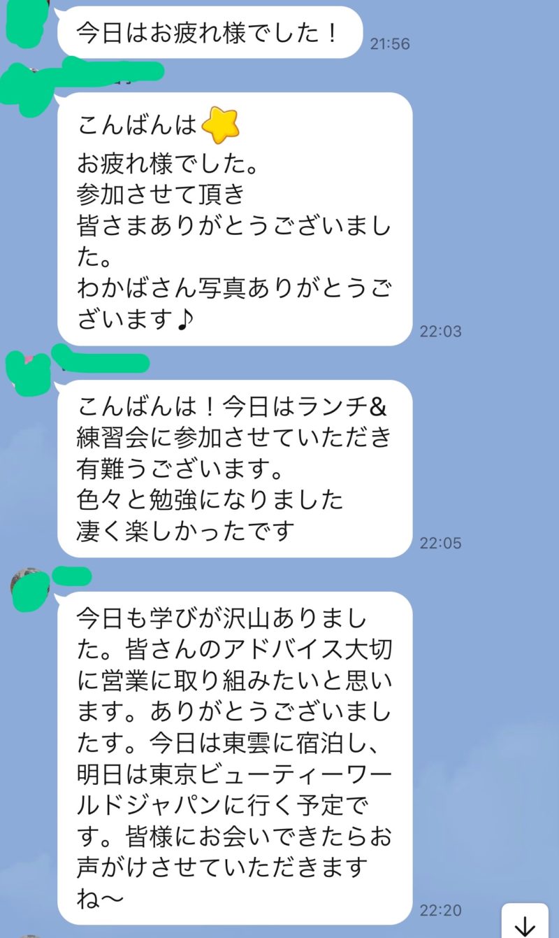 お顔そり美容法と出会ったきっかけや神戸までスクール通っていた時、実は通帳になにも入ってなくて大変だったお話や実際美容法を始めてどう変わっていったか、顧客満足度は長く施術するだけじゃないということや子どもに泣かれながら通ってたという話や生活に余裕もできて子どもの行事を優先してゴールデンウィーク休んでも、売上はしっかりある^^といった話で盛り上がりました。みんな稼いでいるから、声をかけたら飛行機や新幹線ですぐ来てくれる^^