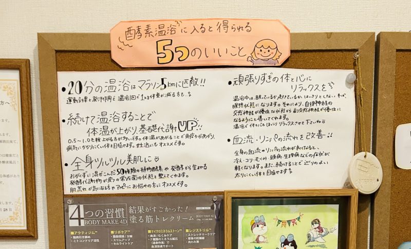 お客様におすすめいただいた酵素浴に行ってきました。初めての体験で約20分体が温まり、ぬくぬくして気持ちよかった〜と水分補給しながら目を引いたpop。