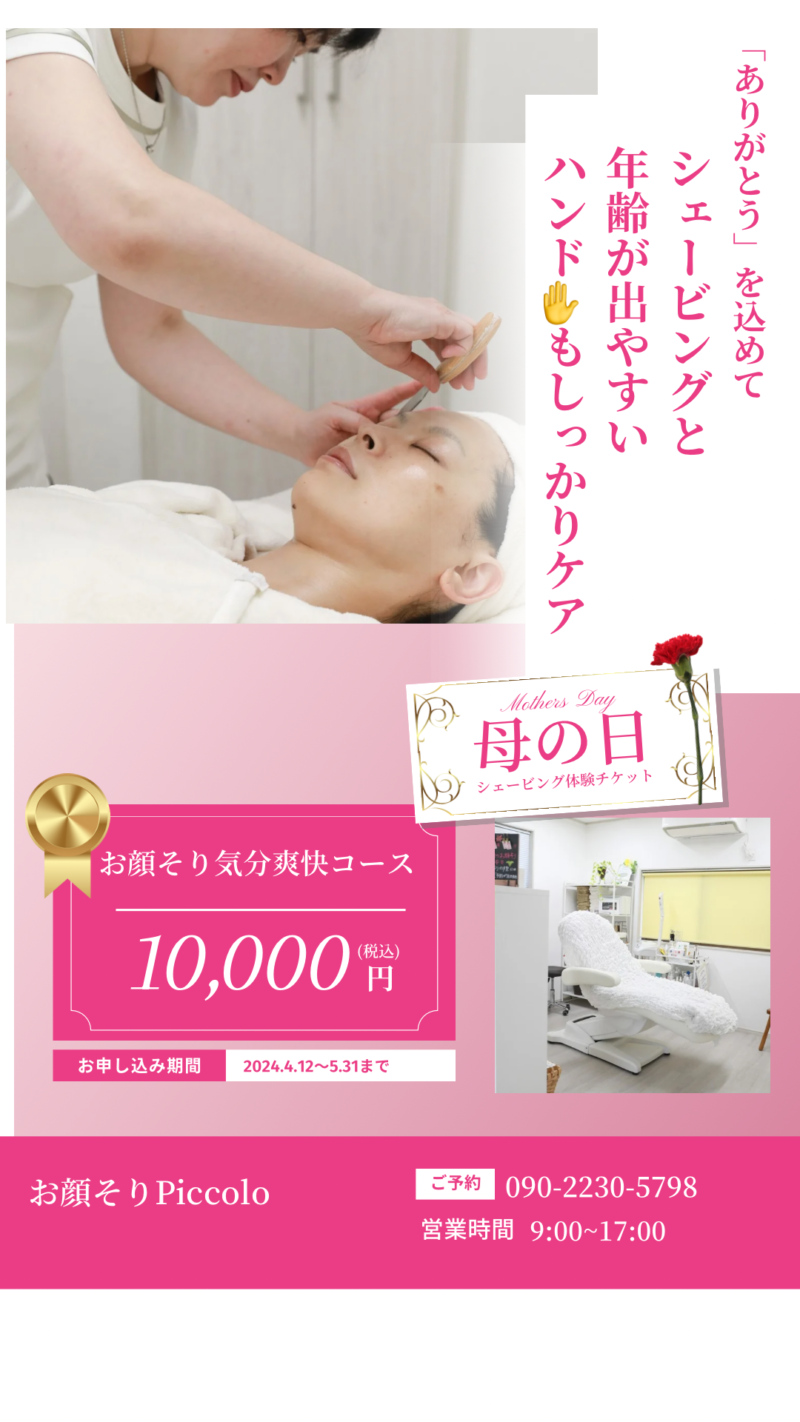 お顔そりのきっかけ作りとして、母の日に気分爽快コース作りました。