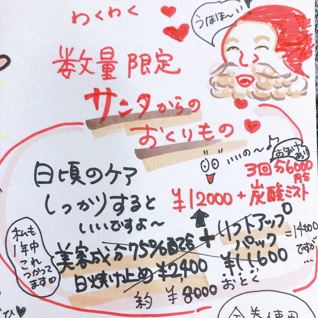 12月限定の福袋は①簡単に、②リフトアップして、③しっとりをキーワードにした【サンタからのおくりもの】お値段も新規オープンした記念の年だから思い切って割引。