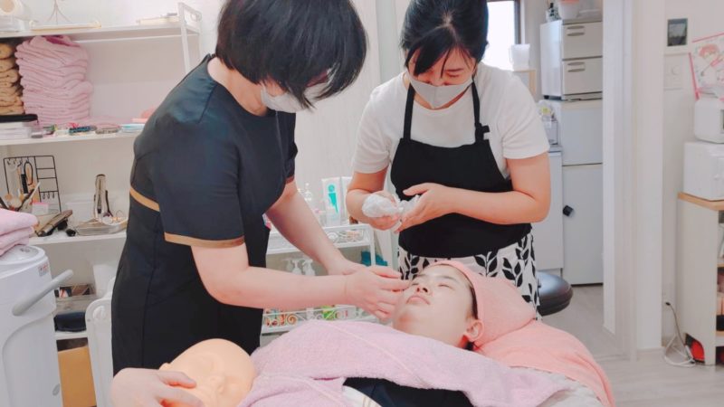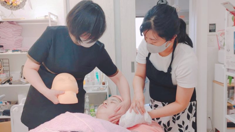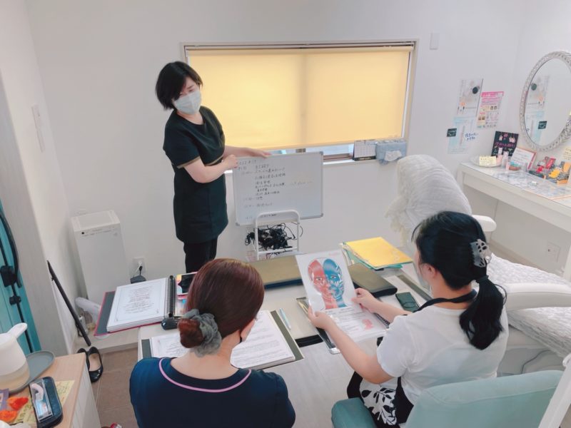 お顔そり美容法の工程DVDがある程度覚えられているかの確認。まずはお互いに施術する側とされる側を体験。